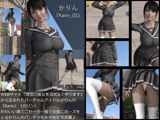 WEBサイト『理想の彼女を3DCGで作ります』から生まれた写実的ヴァーチャルアイドル女優「かりん」の写真集です。表紙を含めて全53ページです。激ミニのセーラー服に身を包み元気にポーズをとる彼女のパンチラをひたすら狙い撮る写真集!!大元の画像が横1820×縦2570ピクセルのため、作品本体はPDFですがかなりの拡大に耐えます。